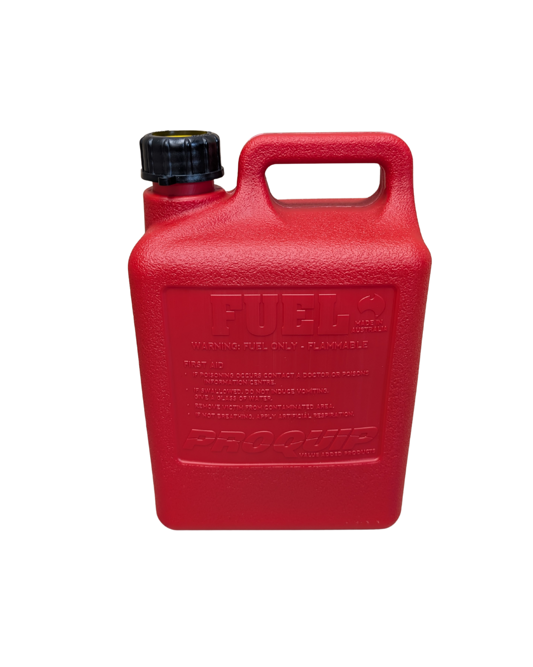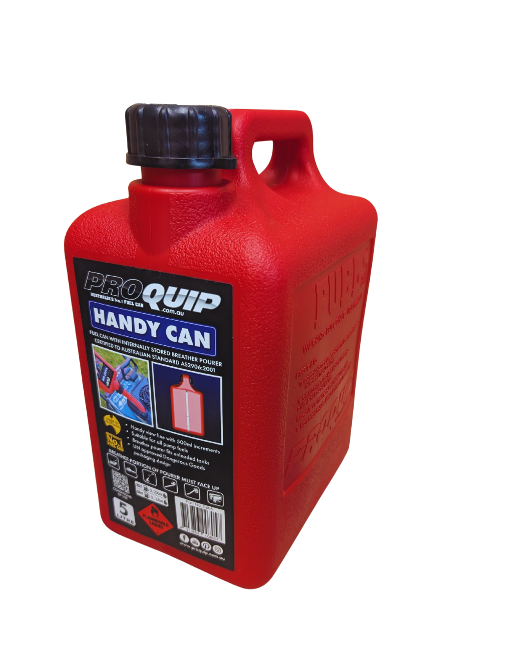 This 5L gas/fuel can is contructed with durable UV-treated HDPE. It features an internally stored flexible pourer to prevent contamination, is designed to fit standard RV racks with a slip-resistant embossed surface, and is certified to Australian Standard AS2906:2001.